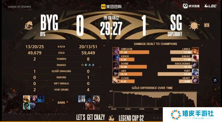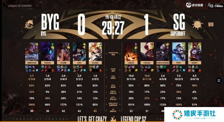 直播吧11月28日讯 老头杯(传奇杯)S2继续双败淘汰赛,本次淘汰赛将采用双螺旋全局BP的模式!今天首场败者组的比赛将会是Puff带队的SG(超级BUFF)对阵Doinb带领的BYG(冰游冠军)! 第一局比赛开局BYG下路组想干扰Kakao盲僧打野结果自己直接爆炸,SG前期拿下经济和资源的优势,小龙也给到BYG压力!中期BYG依靠两波打团一度拉回经济差!关键龙魂团Kakao盲僧单防Doinb阿卡丽,SG追击打出1换4,拿下风龙魂+大龙之后依靠Langx大纳尔绕后留住BYG两人,SG在下路二塔团战团灭BYG,一波赢下首局!
